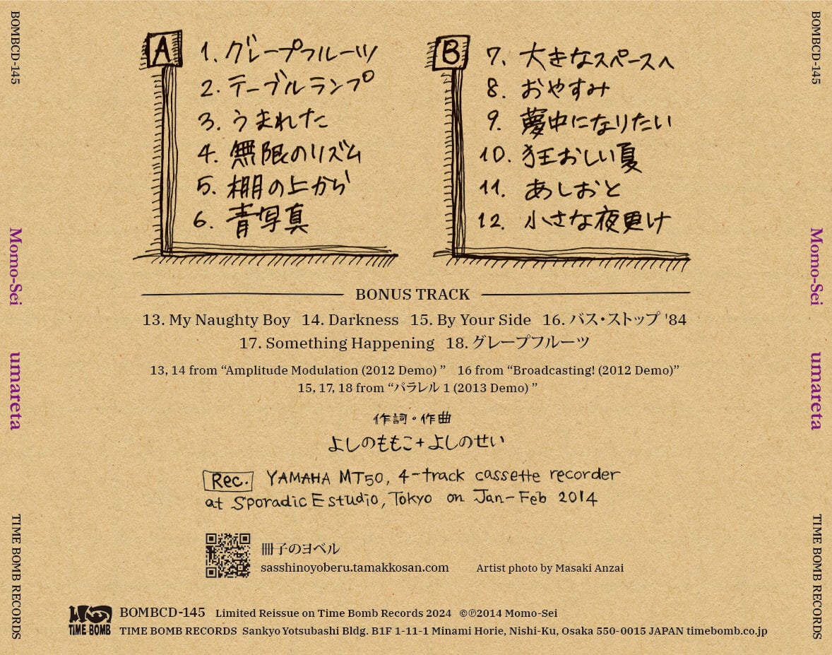 よしのももこ・よしのせい、二人のソングライターがコンビを組んで2014年にリリースした12曲入りの1stアルバムです。完売したまま放置されていたこの作品を2024年にタイムボム・レコーズがリマスター再発、CDバージョンはアルバムよりも前につくられたデモCDRからの6曲がボーナストラックとして収録されています。