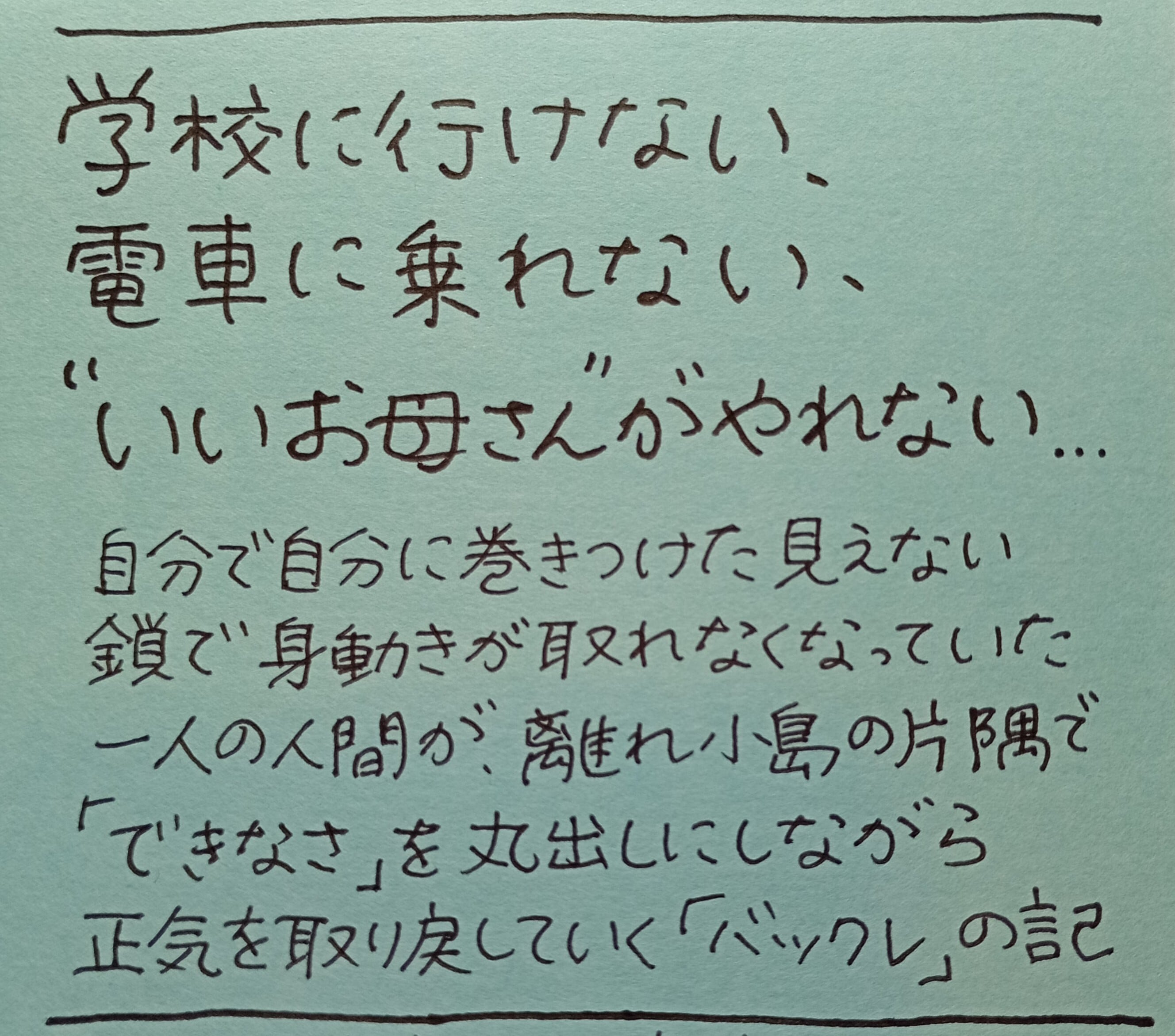 自分で自分に巻きつけた見えない鎖で身動きが取れなくなっていた一人の人間が、とある離れ小島の片隅で「できなさ」を丸出しにしながら正気を取り戻していく「バックレ」の記録。